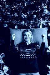 Funny christmas night at home a smiling blonde woman in a red sweater relaxing beside a bright christmas tree and gifts