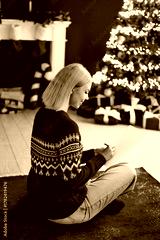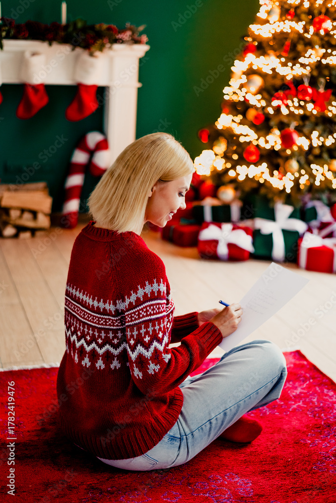 Playful christmas moment a girl sits on a red rug writing a letter by a twinkling christmas tree and cozy home decor