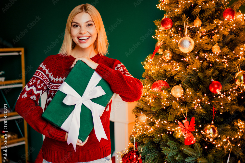 Hilarious holiday moment as a woman in a red sweater holds a green gift beside a twinkling Christmas tree at home