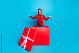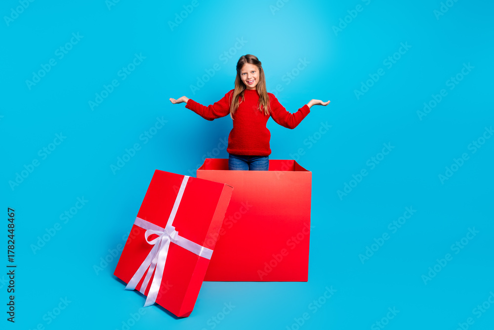 Girl in red sweater stands inside a large red gift box with lid on a blue background celebrating christmas joy