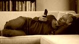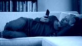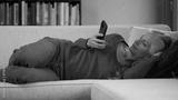 A mature woman lounges on a sofa, dressed in a red top and jeans, focused on her smartphone in a well-lit living room with bright blue walls and book shelves in the background.
