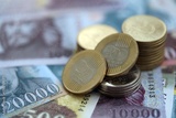 Stack of Hungarian Forint currency money bills and coins. HUF currency banknotes and coins close up