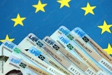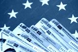 Permanent resident or residence permit cards lies on European Union flag. Paper specimen cards close up