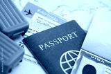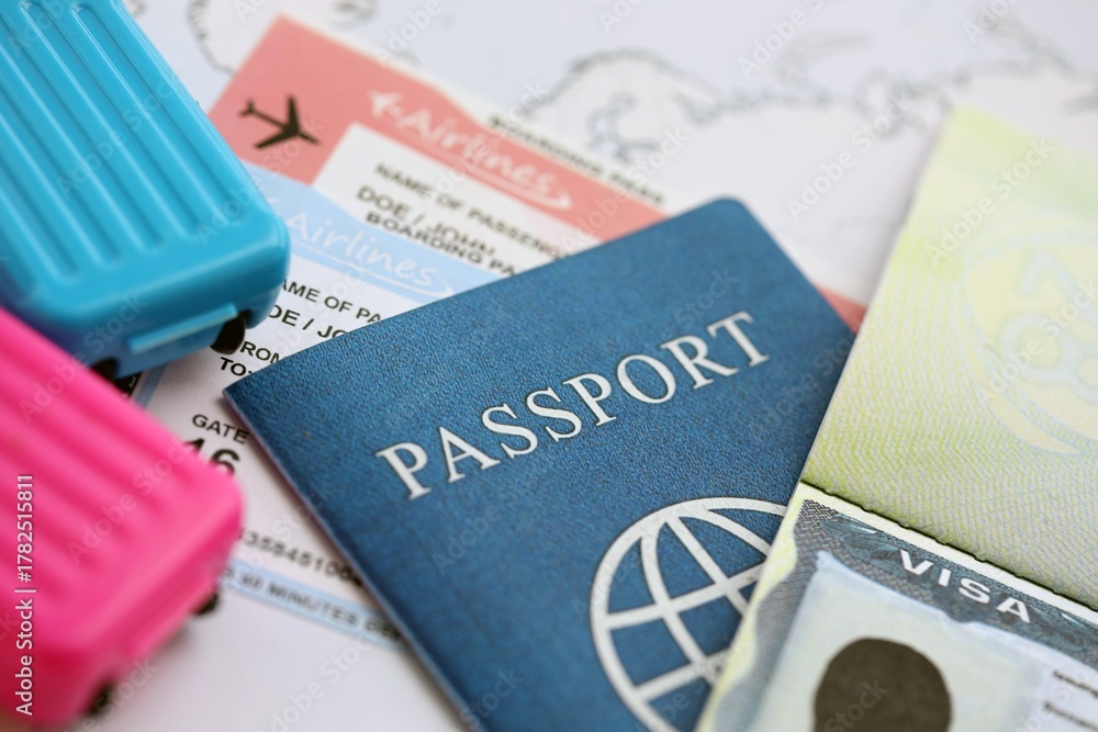 Passport and visa with boarding pass tickets and toy luggage bags on world map close up
