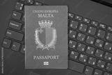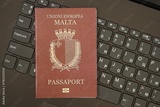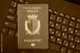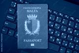 Malta passport lies on black laptop keyboard buttons background close up. Technologies and control in Europe concept