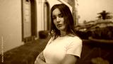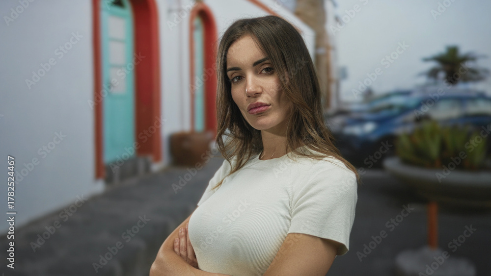 Woman crossing her arms near a pastel building facade on sunlit street corner, pouting lips and sideways glance; rejection.