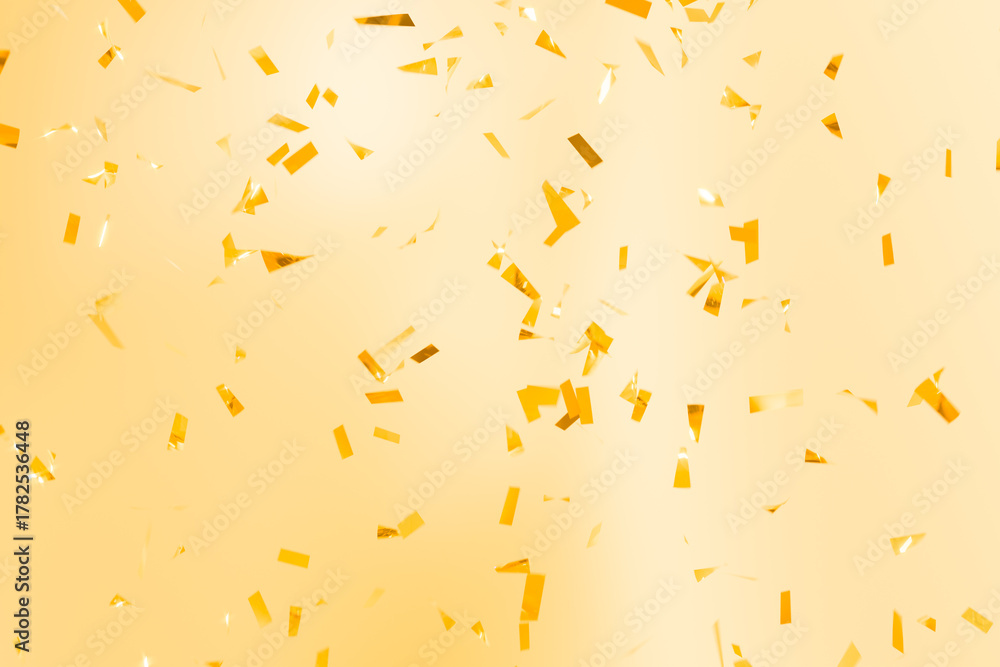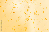 3D rendering of falling golden confetti on a yellow background. Festive backdrop perfect for holiday sales, celebrations, weddings, Valentine’s Day, and promotional banners.
