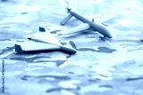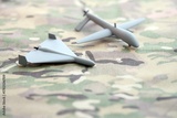 Unnamed grey toy drones models on camouflage fabric close up. Kamikaze drone and observation drone