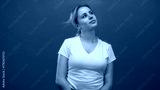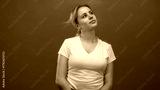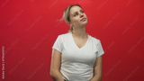 Young blonde woman tilting head and looking up in a red studio backdrop wearing a white v neck t shirt; contemplation.