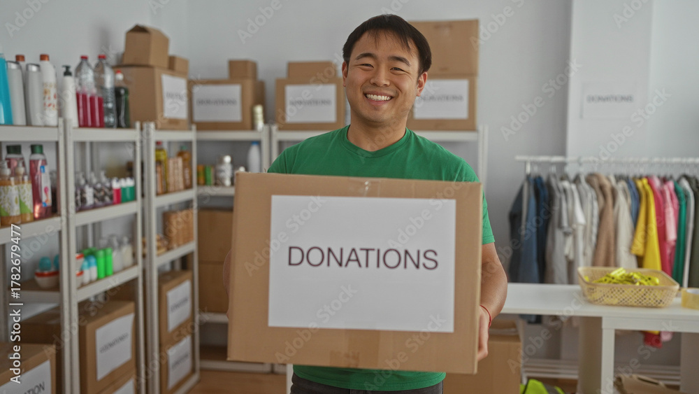 Smiling man in a donation center holding a box labeled donations surrounded by shelves and clothing racks