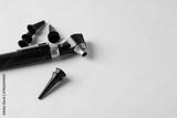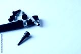 Hearing test. Modern otoscope and ear speculums on yellow background, closeup. Space for text