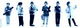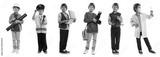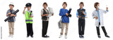 Choice of profession. Cute boy in different clothes representing various occupations, collage on white background