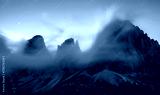 View of the Langkofel group embraced by clouds at sunset in South Tyrol, Italy.