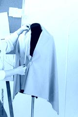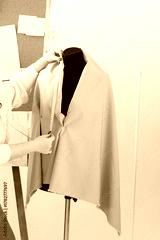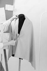 Tailor measuring fabric on black mannequin in fashion studio. Precision, craftsmanship, and garment creation process in professional atelier.