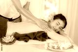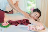 Young Asian woman receiving salt massage in spa salon, Hand putting salt scrub on female back, Spa concept