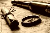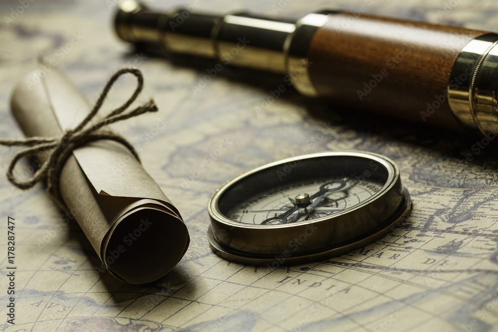 Retro compass with old map and spyglass