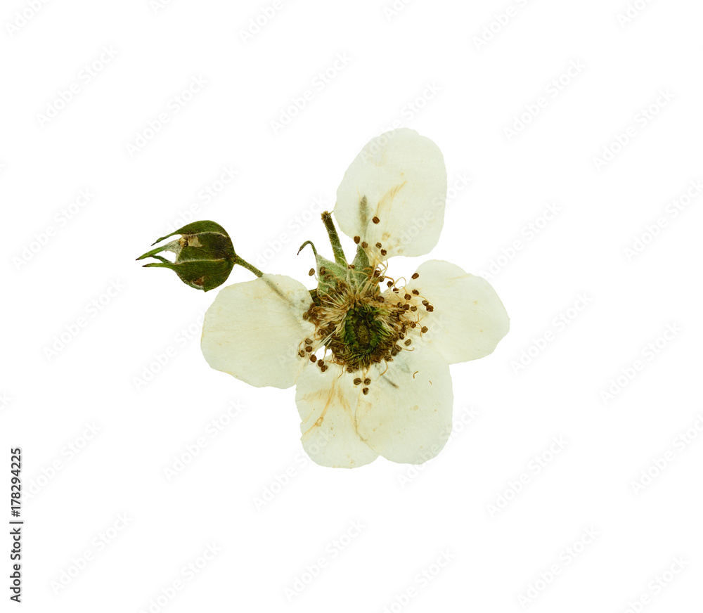 Pressed and dried buds and bright white flower blackberries