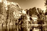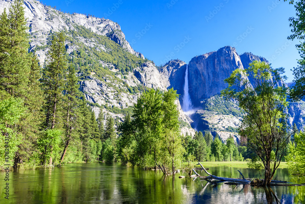 Yosemite National Park - Reflection in Merced River of Yosemite waterfall and beautiful mountain landscape, California, USA