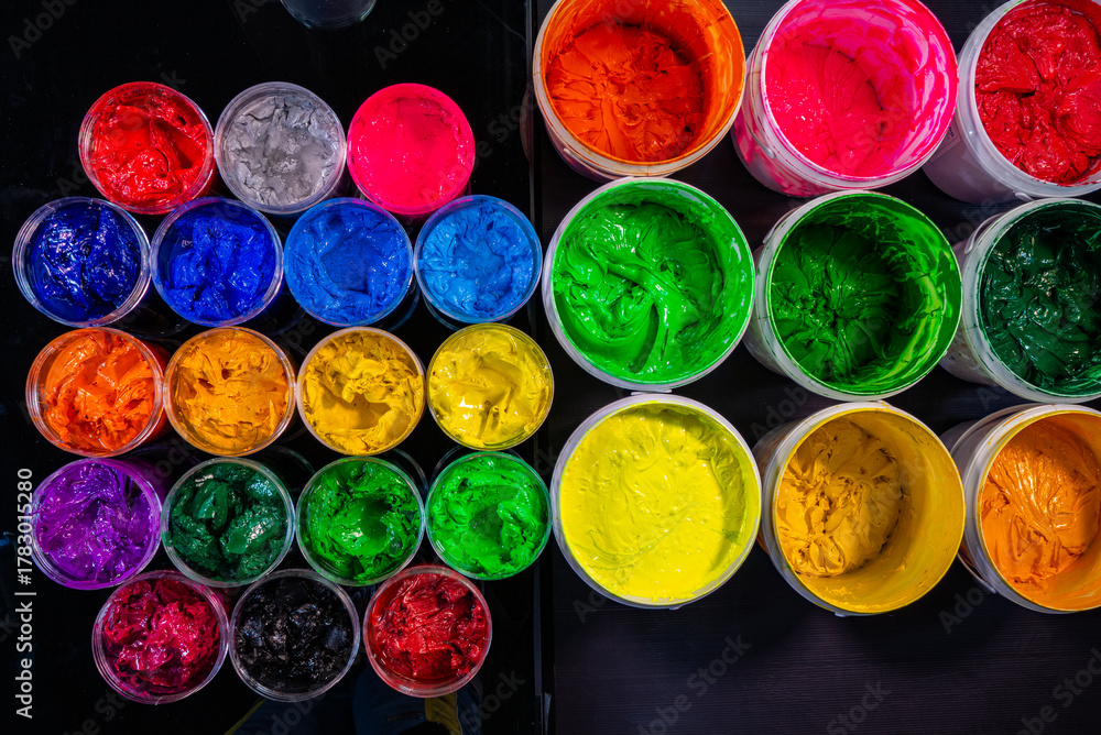 A collection of plastisol inks stored in sturdy barrels and glass jars, each filled with rich and vibrant colors red, blue, yellow, green, pink, orange, purple, and white in screen printing factory