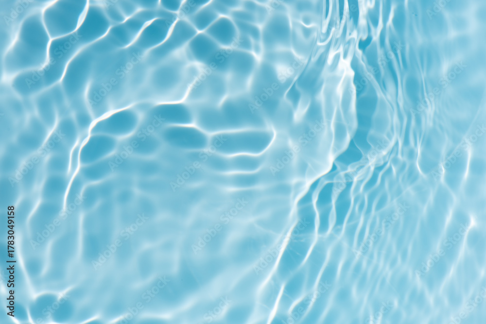 Blue water with ripples on the surface. Defocus blurred transparent blue colored clear calm water surface texture with splashes and bubbles. Water waves with shining pattern texture background.