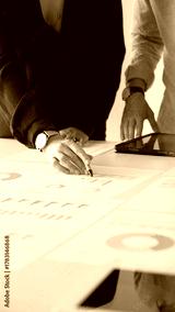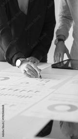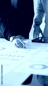 Professional team reviewing financial documents, pointing at charts on desk, collaborating to analyze data and strategize business growth. Business people concept