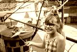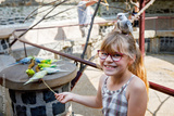 Excited little school girl with eyeglasses feeding colorful parrot birds at zoo or aviary. Happy child interacting with animals outdoors. Real life authentic family lifestyle moment