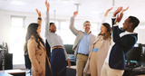 Corporate, people and hand stack in office for motivation, teamwork and celebration of success. Smile, staff and partnership for agreement, collaboration and solidarity support of company achievement