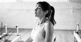 Breathing, relax and woman on reformer machine in studio for cool down exercise for wellness. Peace, equipment and calm female person with recovery on break for pilates class workout in health gym.