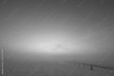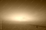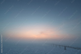Peaceful winter sunrise over snow-covered fields with soft fog and pastel sky