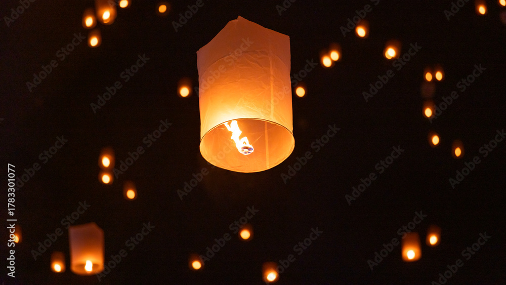 Sky lantern floating in the dark night sky, Tourist floating sky lanterns, Sky lanterns floating on night of Yi Peng, Loy Krathong Festival or Yi Peng Festival in Chiang Mai Thailand.