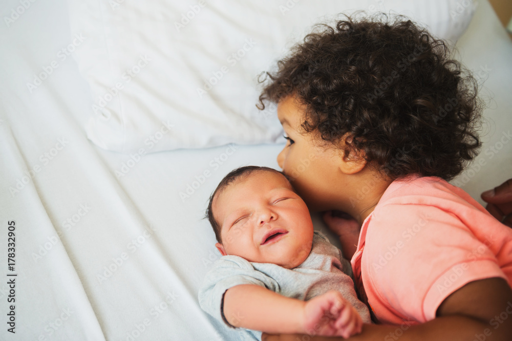 First meeting of adorable african toddler boy and his newborn brother in a prenatal hospital