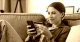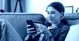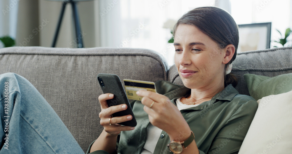 Credit card, phone and woman in home for online shopping, internet purchase and student payment. Ecommerce, technology and person on house sofa for application fee, scholarship or college funding