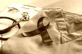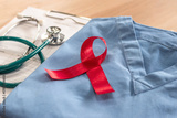 World aids day and national HIV AIDS and ageing awareness month concept with red ribbon on medical or surgical doctor's lab uniform on work desk in hospital background