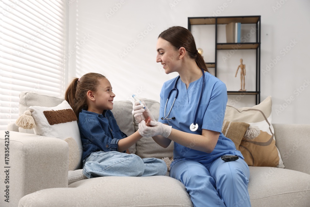 Diabetes. Smiling doctor in medical gloves checking little girl's blood sugar level with lancet pen on sofa indoors