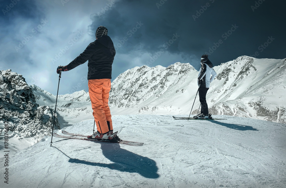 Men and Woman on the ski before sport action at sunny day around