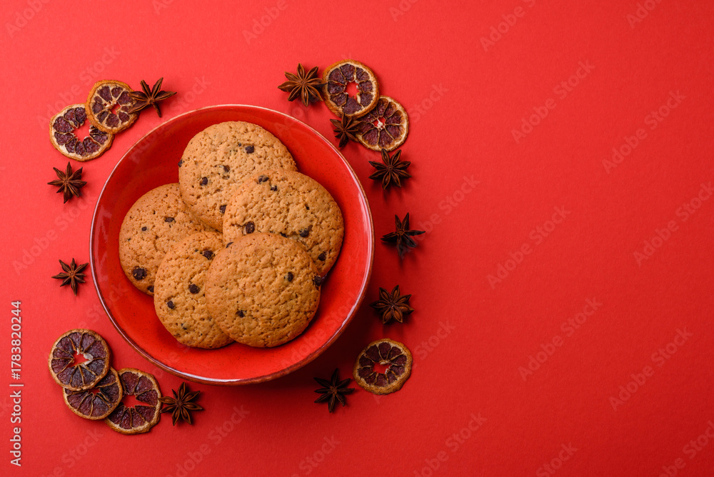 Food, oatmeal chocolate raisin cookies, dessert or breakfast pastry. Oatmeal chocolate cookies