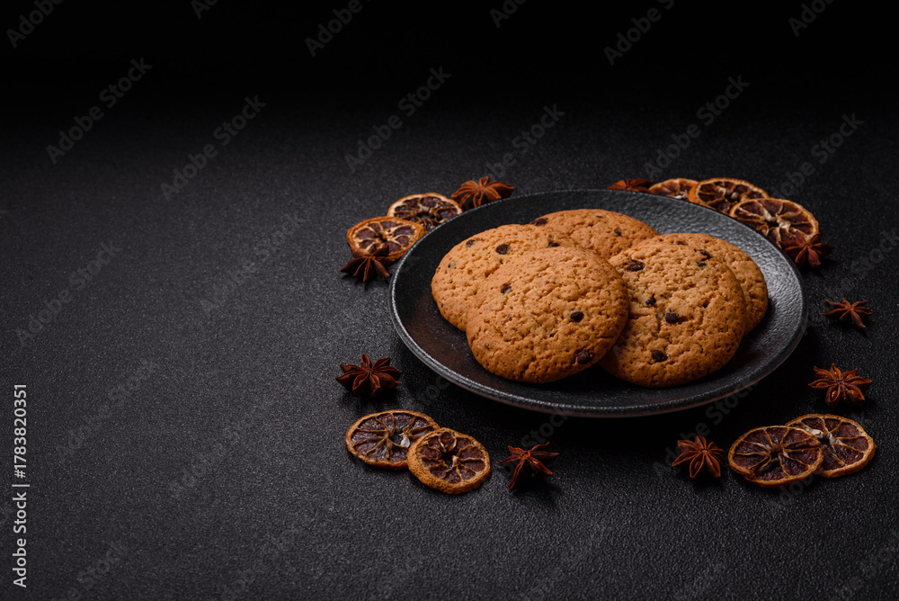 Food, oatmeal chocolate raisin cookies, dessert or breakfast pastry. Oatmeal chocolate cookies