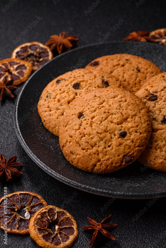 Food, oatmeal chocolate raisin cookies, dessert or breakfast pastry. Oatmeal chocolate cookies