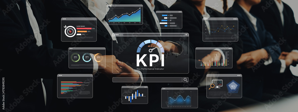 A business intelligence dashboard displaying various Key Performance Indicators (KPI). The data visualization tracks business metrics and measures performance against goals. Fermion