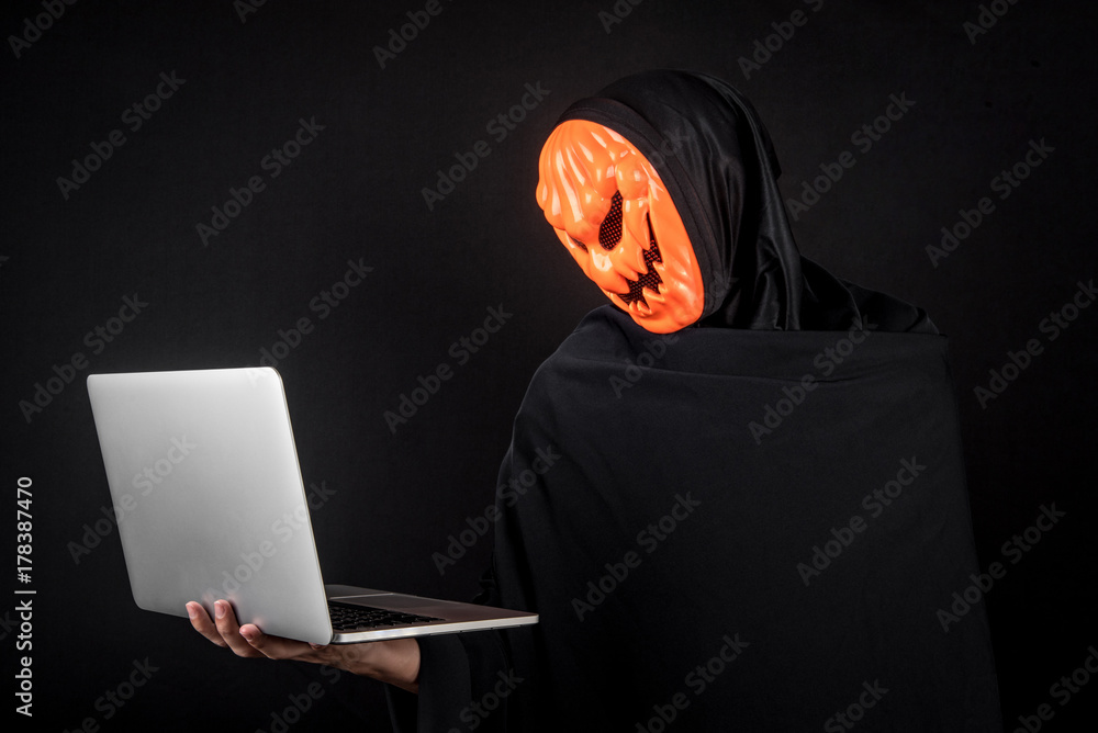 Anonymous male hacker with pumpkin halloween mask carrying laptop computer. Internet security and cyber attack concepts.