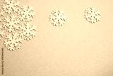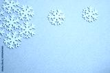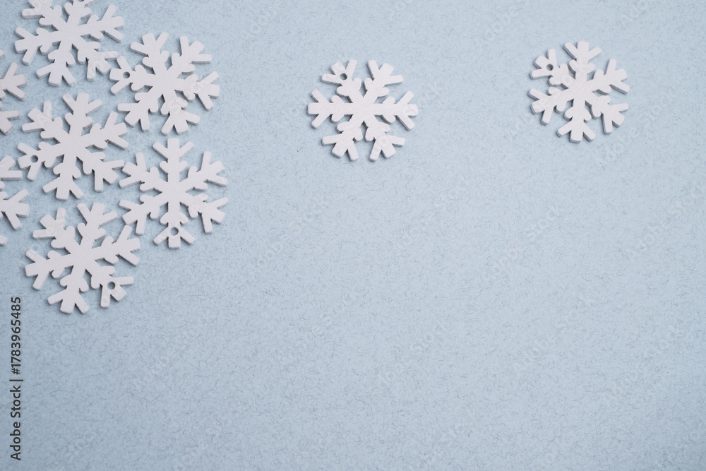 Winter background: clean white snowflakes on a soft pastel blue surface with copy space.