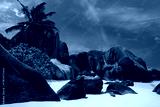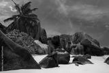 Granite boulders and white sand define Anse Source d Argent on La Digue, Seychelles, as a pastel sunset glows with purples and oranges and a faint rainbow appears.