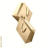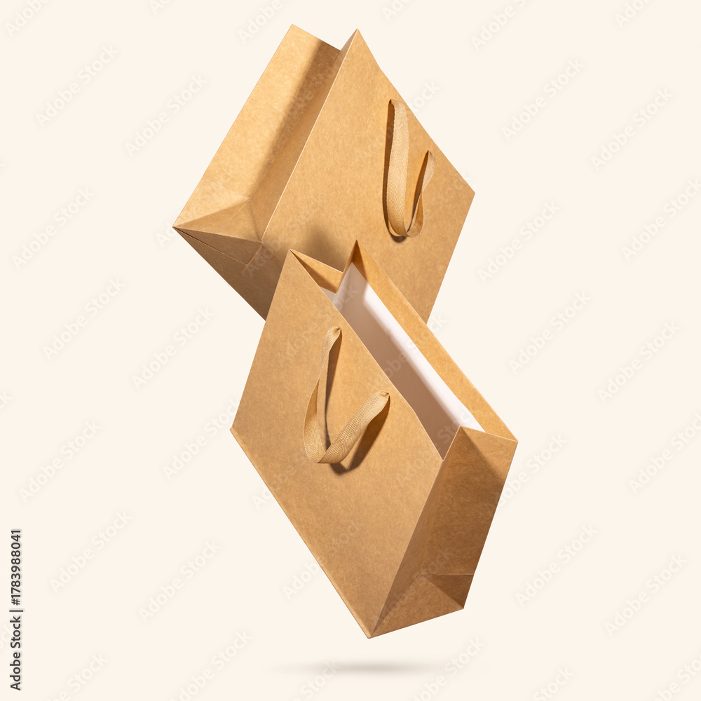 Two kraft paper shopping bags with fabric handles floating on light beige background. Concept of sustainable packaging trends, eco-conscious retail shopping. Mockup for branding, product presentation