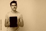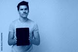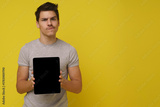 A young man stands against a bright yellow background, holding a tablet in front of him. He has a questioning expression on his face