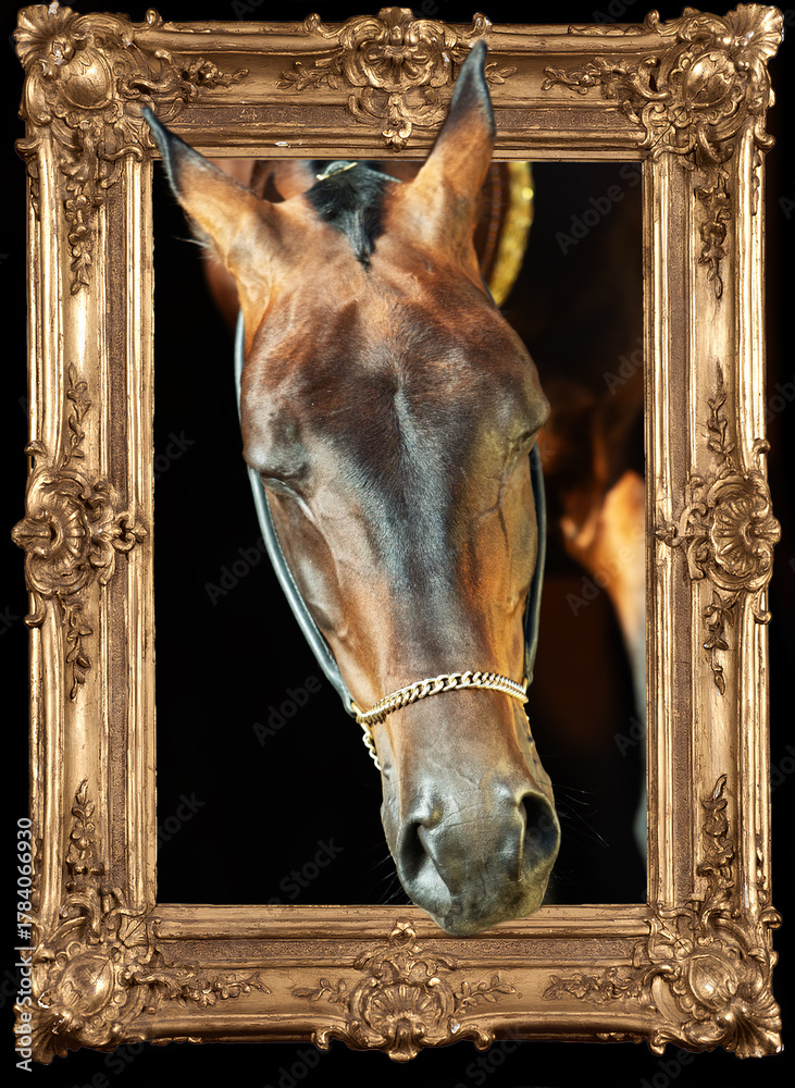art portrait of beautiful dark bay Akhalteke stallion in paint frame. fine art