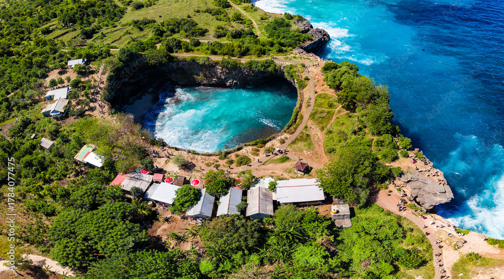 Vibrant turquoise water in a unique circular cove surrounded by cliffs on Nusa Penida