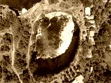 Turquoise ocean water inside a natural cove and rock arch on a tropical island