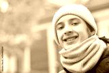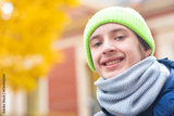 Portrait of a 13-year-old boy in a jacket with a backpack in the city in autumn