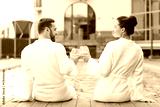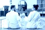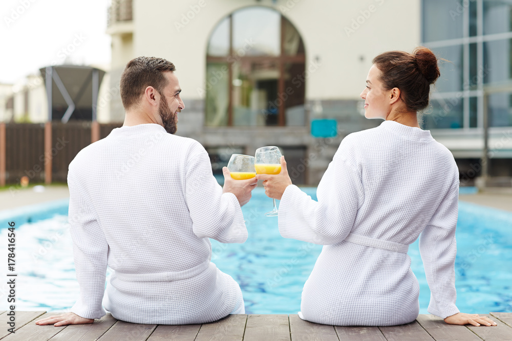 Idyllic couple toasting with glasses of juice while sitting by swimming-pool