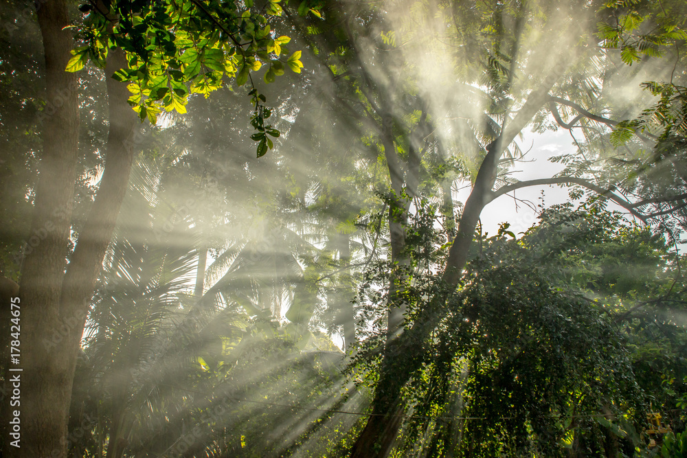 Beautiful view of foggy forest landscape on sunrise with big trees and forest on foreground in Thailand